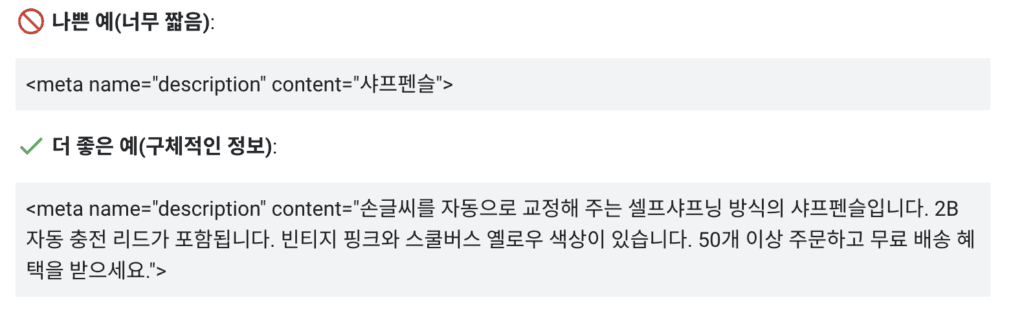 아래는 메타 description을 어떻게 작성하면 좋은지에 대한 예시를 적어보았습니다. 이 예시를 통해 메타 디스크립션을 작성할 때 어떤 방식이 효과적인지 참고해보시길 바랍니다.