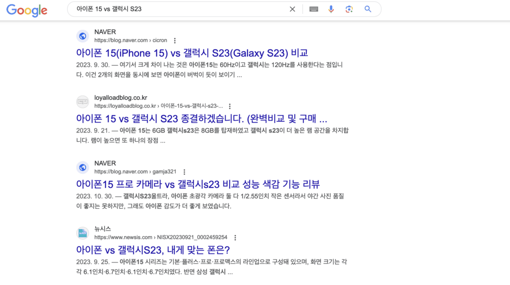 예시 : 스마트폰 비교 – “아이폰 15 vs 갤럭시 S23”
